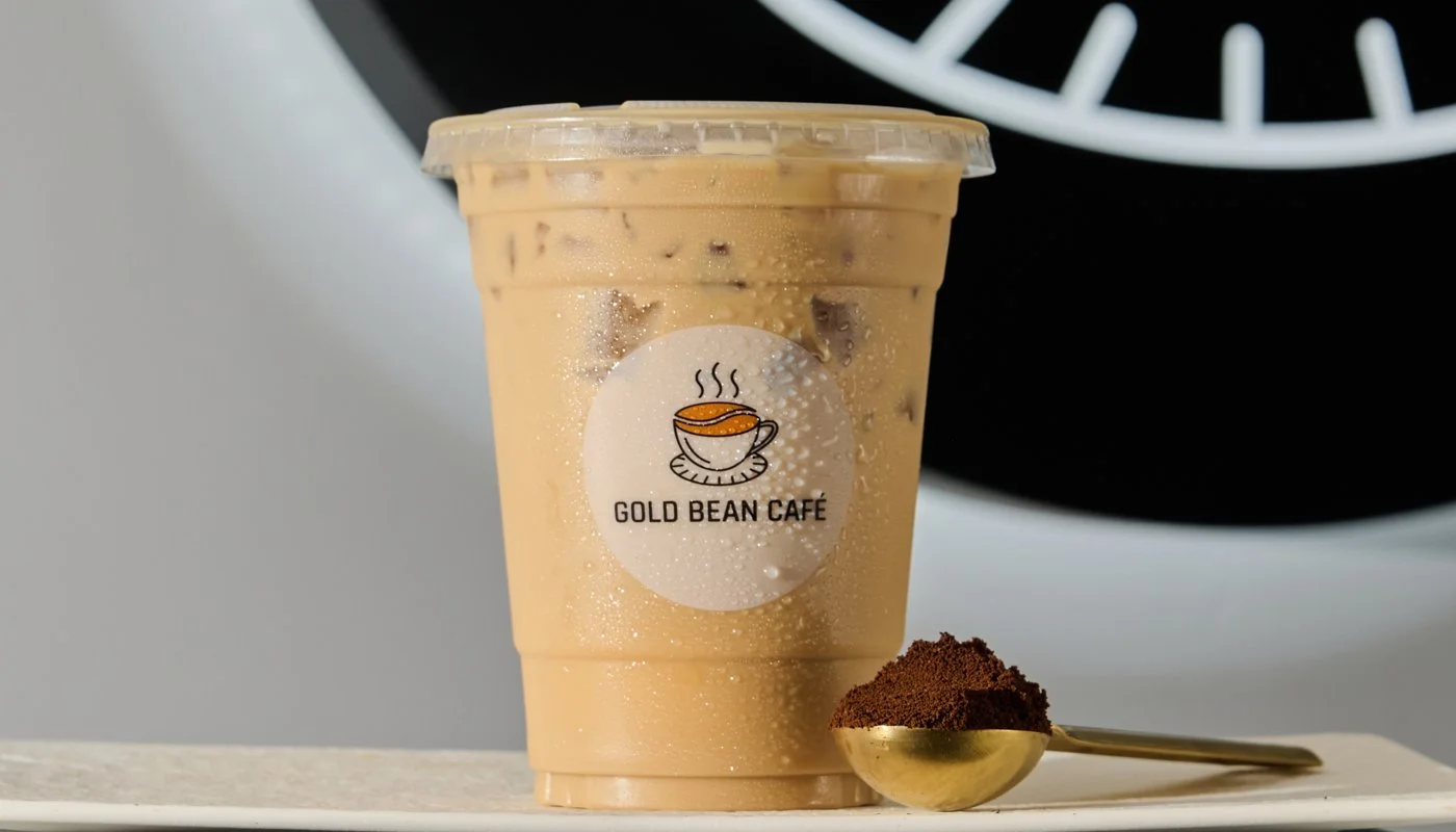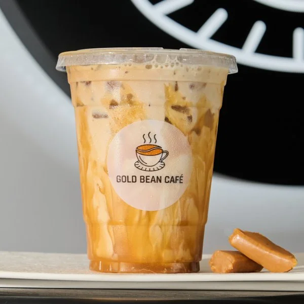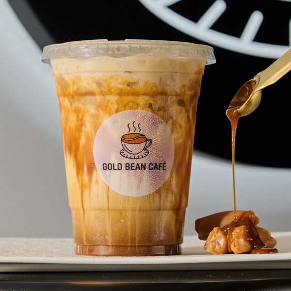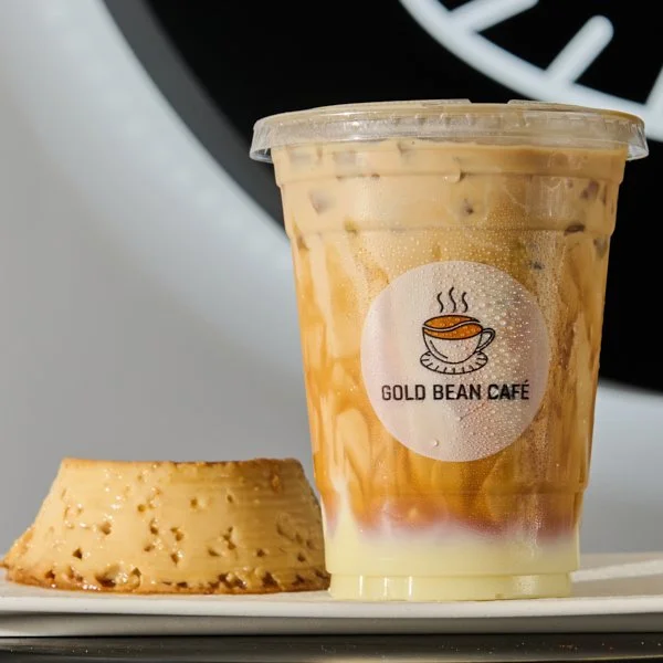 Iced latte with flan-inspired caramel, creamy, dessert-like finish.