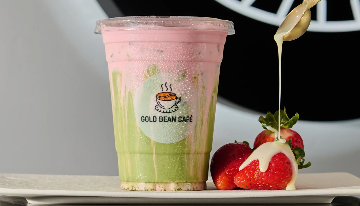 Matcha topped with strawberry & cream cold foam.