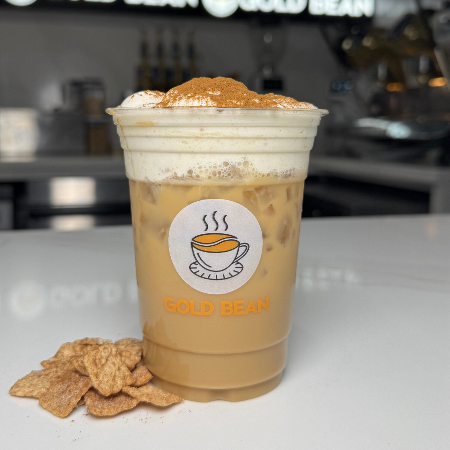 Iced coffee topped with creamy Cinnamon Toast Crunch soft top.