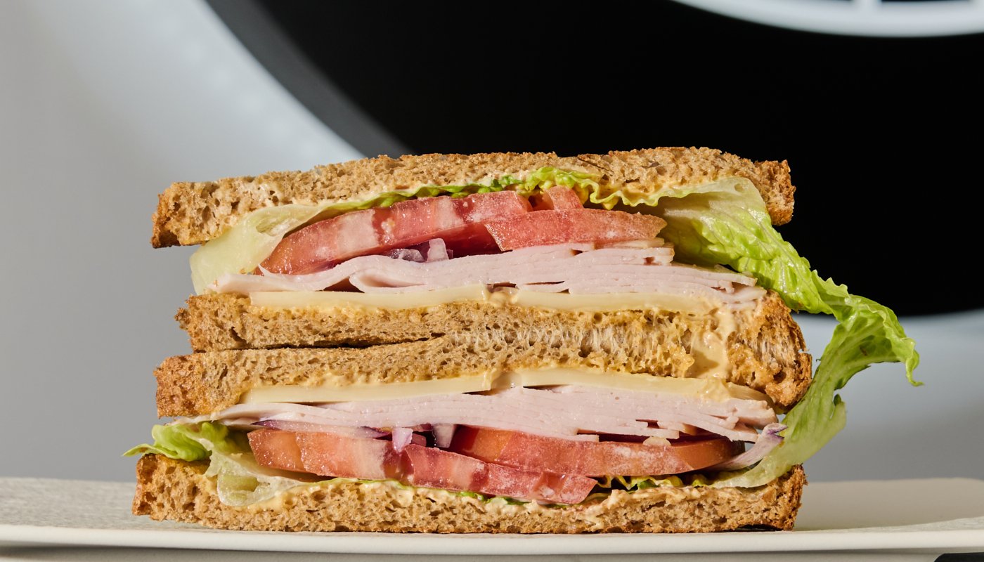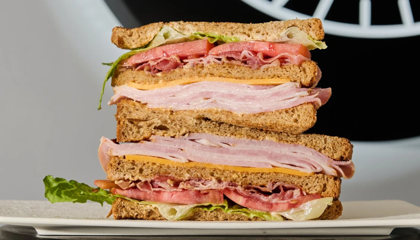 Triple-deck toasted wheat with turkey, ham, bacon, cheddar, lettuce, tomato, and house sauce.